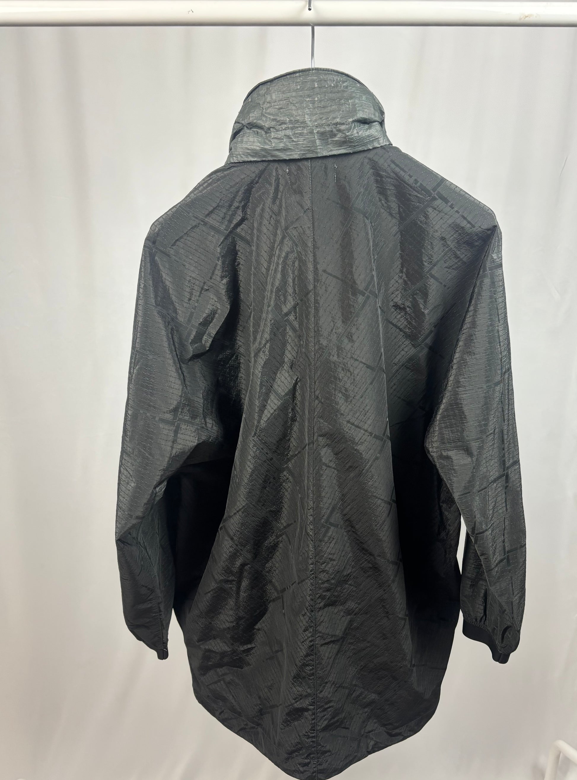 This Stone Island jacket features a lightweight, textured black nylon with a subtle grid pattern for a sleek, technical look. It includes a front zip closure and the signature compass logo patch on the chest for a clean, minimalist aesthetic.